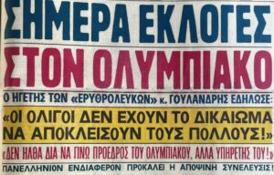 Πραγματοποιείται ιστορική Γενική Συνέλευση στον Ολυμπιακό, η οποία συγκλήθηκε από τον μεγάλο Νίκο Γουλανδρή, κατά τη διάρκεια της οποίας εγγράφονται 481 νέα μέλη. Ανάμεσά τους οι Σωκράτης Κόκκαλης και Μιλτιάδης Μαρινάκης, πατέρας του σημερινού προέδρου